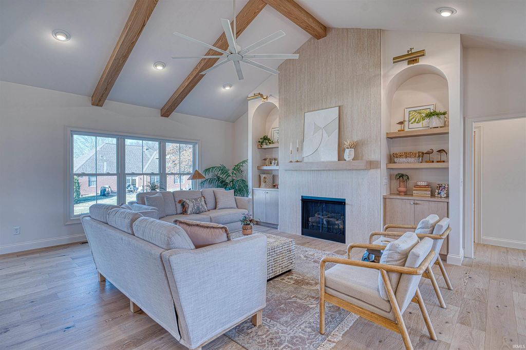This stunning new construction CAC custom home showcases 3,716 square feet of thoughtfully designed living space, with every detail carefully considered and every inch beautifully utilized. The first floor welcomes you through a beautiful front door into a foyer that opens seamlessly to an open-concept living, kitchen, and dining area. Vaulted ceilings with natural oak beams create architectural interest, while wide plank white oak flooring throughout adds a warm, cozy, and modern feel. The focal point of the living area is a cozy fireplace, with custom built-in shelving on either side. The kitchen is truly the heart of the home, featuring a generously sized island, custom quartz countertops, and a ceramic tile backsplash, perfect for both everyday living and entertaining. The primary suite, conveniently located on the first floor, offers a spa-like retreat with a soaking tub, custom-tiled shower, and his-and-her vanities. The primary bedroom also connects directly to the first-floor laundry room for added convenience. Two additional bedrooms complete the main level and share a full bathroom. Upstairs offers over 1,500 square feet of finished, highly versatile space, including an additional bedroom, a full bathroom, and two bonus rooms that can be imagined into anything an owner desires, from entertaining and everyday living to home office, hobby, or storage space. Additional highlights include a spacious three-car garage with epoxy flooring and a covered back porch, perfect for relaxing or hosting guests.